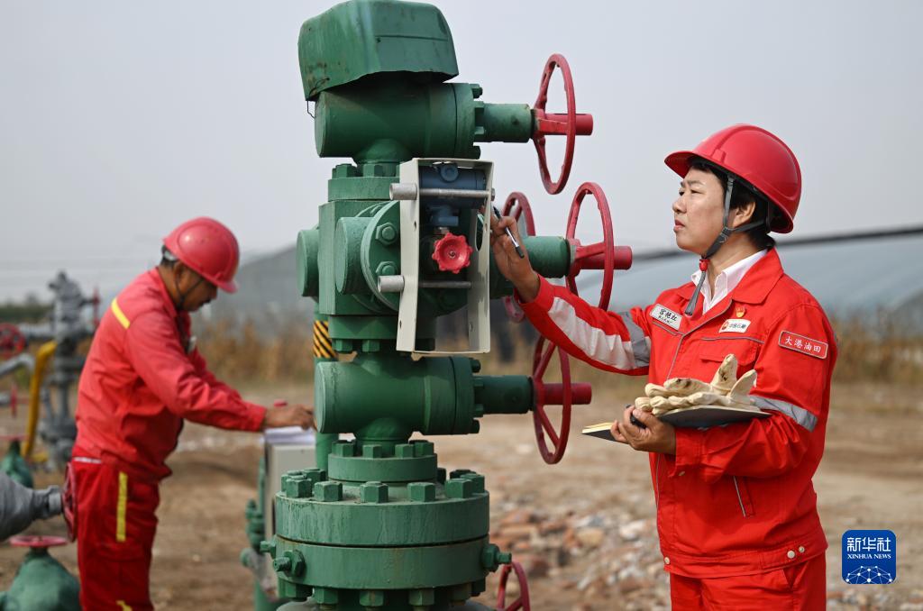 10月18日,在中國石油大港油田第三採油廠第六採油作業區,宮艷紅(右)查看油水井運行狀態。