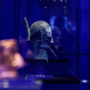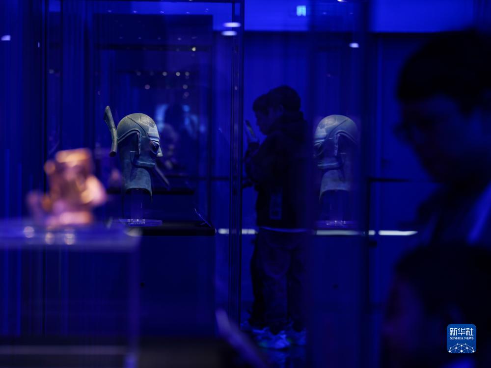 10月19日,在2023成都世界科幻大會主場館雨果廳,觀眾在觀看金沙遺址出土文物的仿製品。