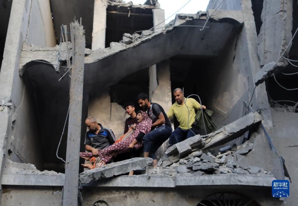 10月19日,在加沙地帶南部城市汗尤尼斯,人們在遭以色列空襲後的建築廢墟中救援傷者。