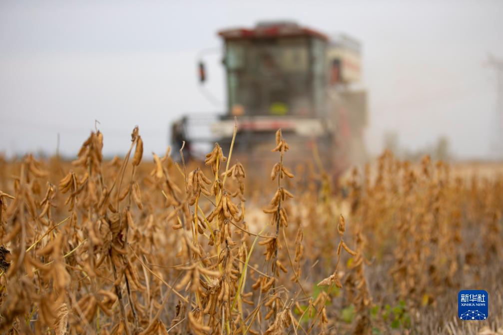10月19日,在山東省東營市廣饒縣李鵲鎮西張莊村玉米大豆帶狀複合種植田裏,農民駕駛收割機收穫大豆。