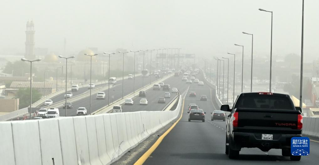 10月19日,汽車在被沙塵暴籠罩的科威特首都科威特城的街道上行駛。