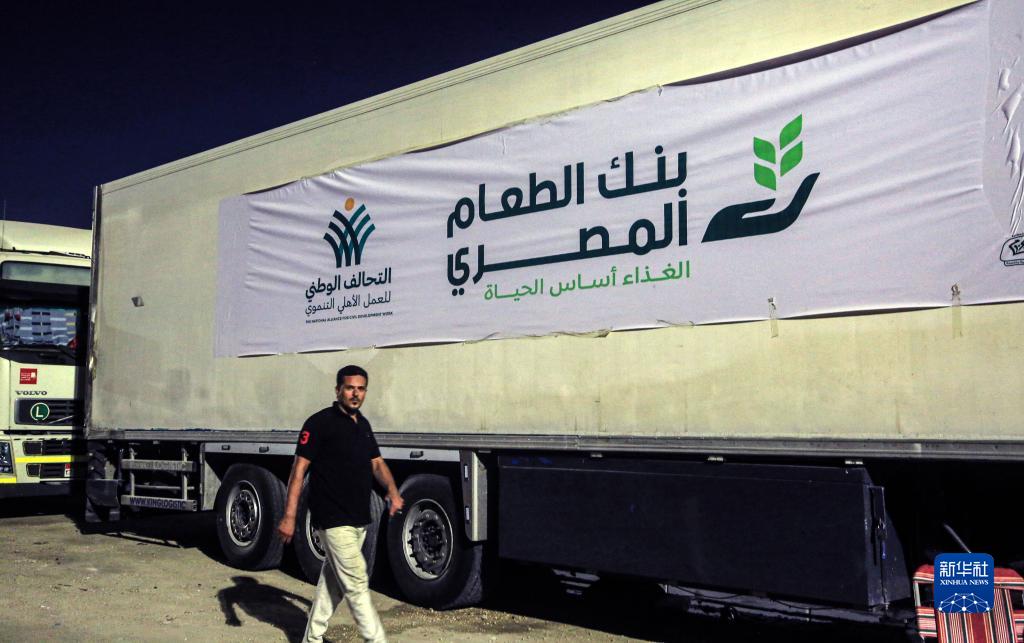 10月19日,在拉法口岸埃及一側,一名男子走過裝載有人道援助物資的貨車。