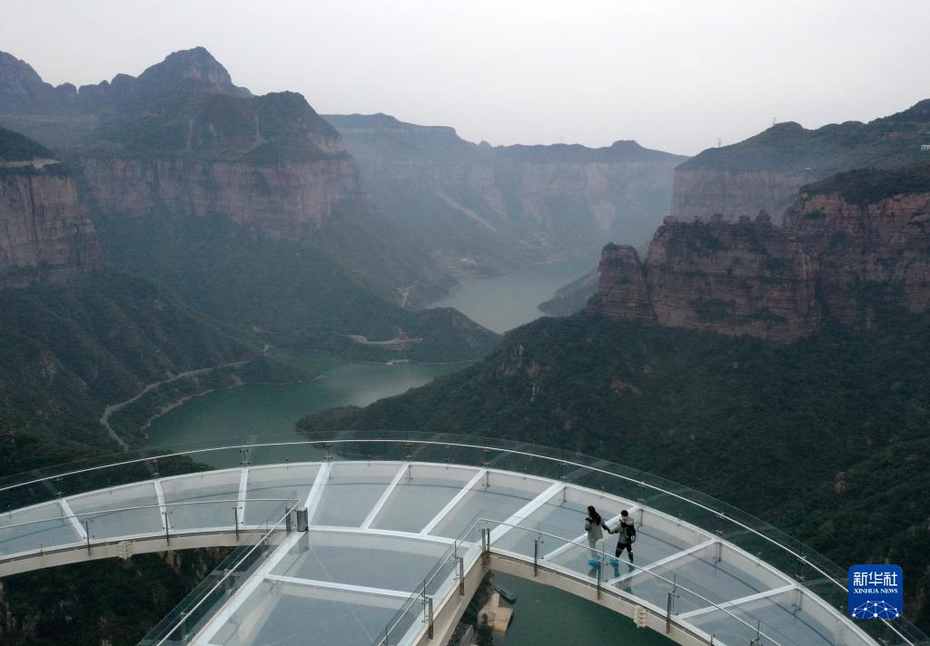 10月19日,游客在河南寶泉旅游度假區的觀景平台游玩(無人機照片)。
