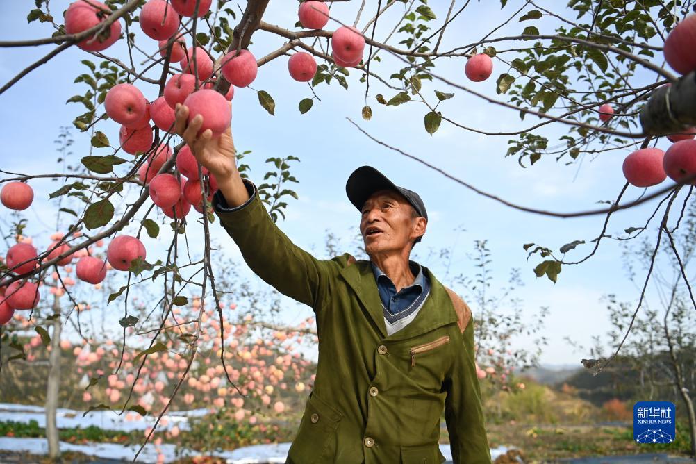 10月19日,南溝村果農胡福義在自家果園查看蘋果長勢。