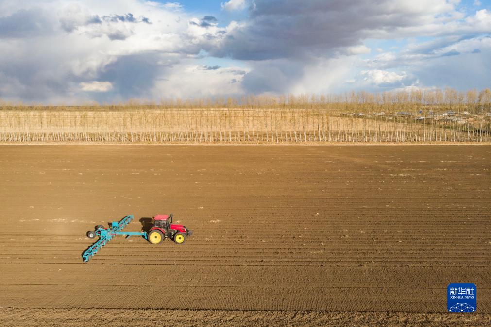 10月19日,在黑龍江省肇東市五里明鎮東升村,農民駕駛機械進行鎮壓保墑作業(無人機照片)。