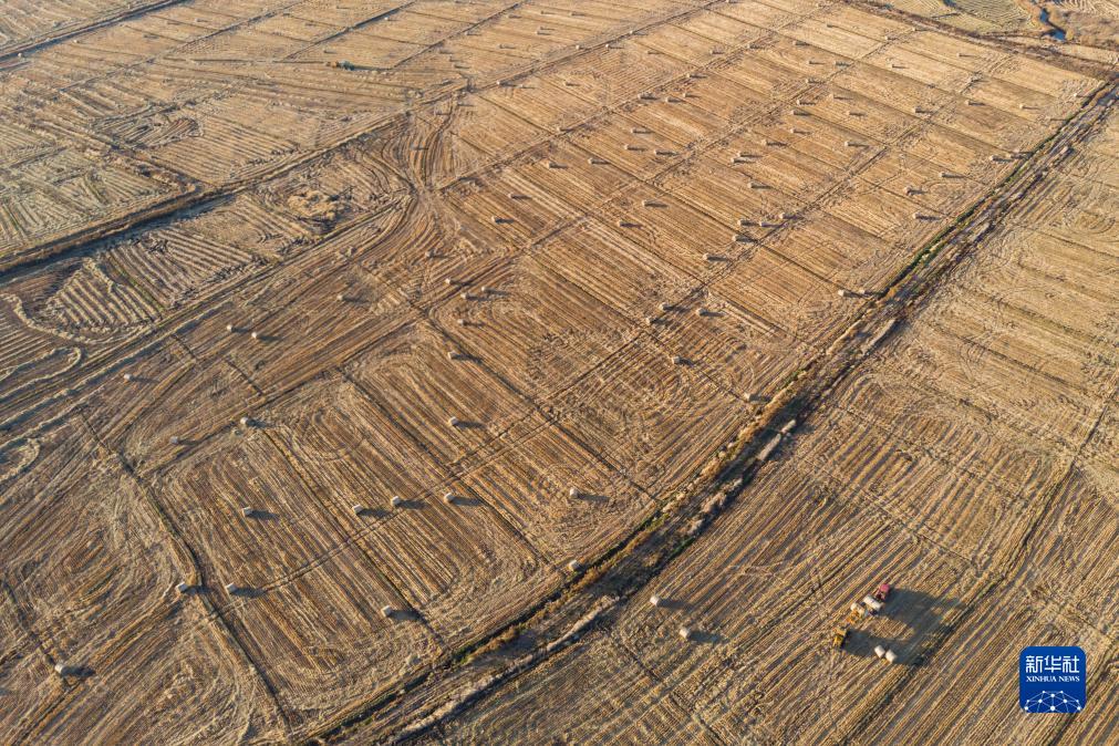 10月18日,在黑龍江省尚志市河東朝鮮族鄉,農民駕駛機械運輸打包好的秸稈(無人機照片)。