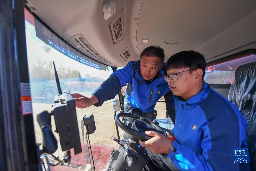 10月19日,在中國科學院“黑土糧倉”科技會戰長春示範區公主嶺示範基地,中國科學院東北地理與農業生態研究所高級工程師陳國雙(左)與團隊成員調試無人駕駛農機。