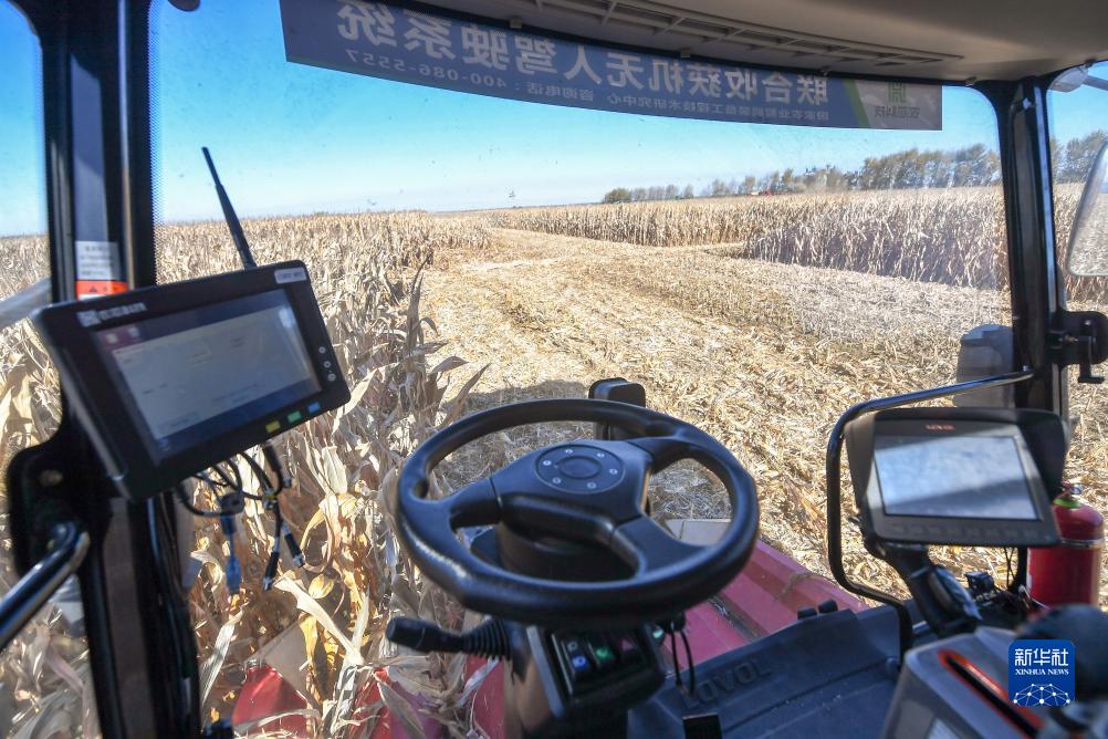 10月19日,在中國科學院“黑土糧倉”科技會戰長春示範區公主嶺示範基地,無人駕駛農機在收穫玉米。
