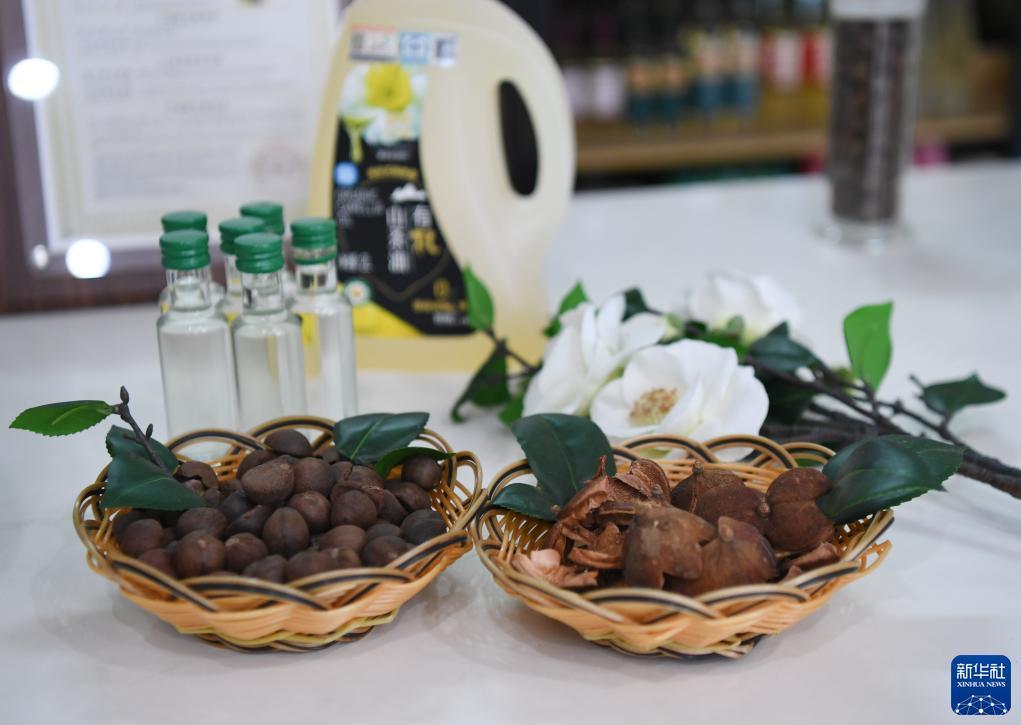 這是在位於乳源瑤族自治縣的廣東寶華農業科技股份有限公司內展示的油茶果以及茶油製品(10月19日攝)。