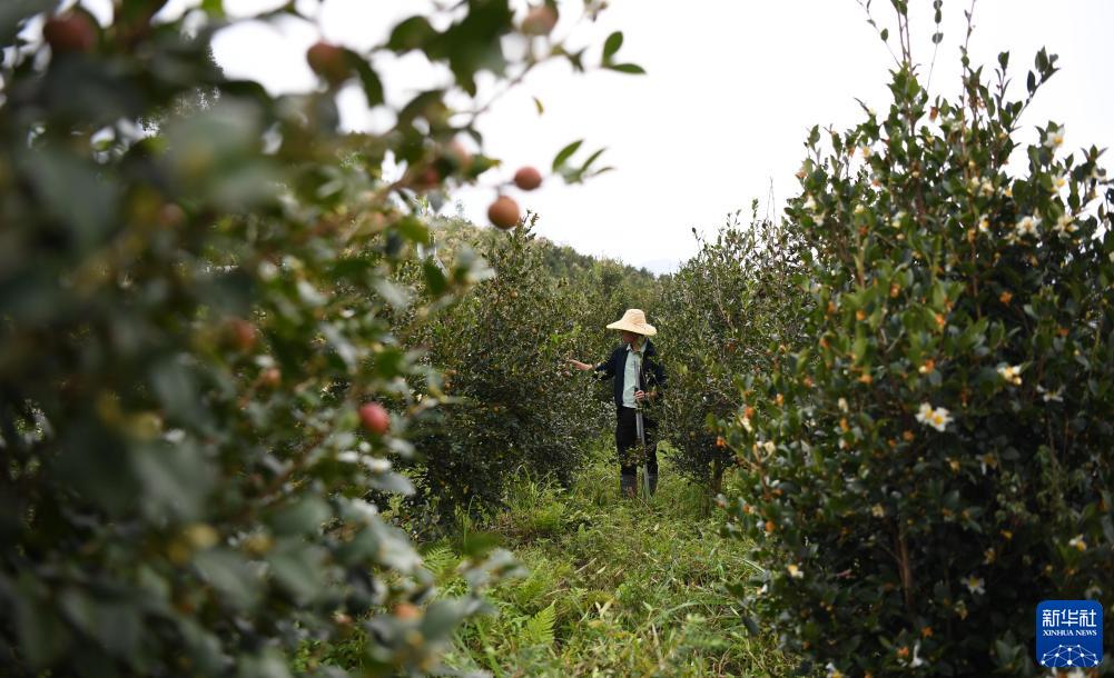 在乳源瑤族自治縣石角塘村的油茶省級現代農業産業園,工作人員查看油茶果長勢(10月18日攝)。