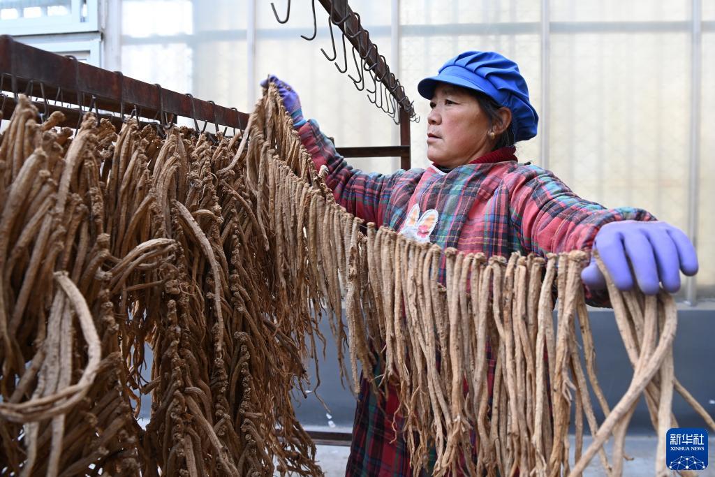 金秋時節,甘肅省定西市岷縣的黨參、黃芪等中藥材陸續豐收,當地中藥材企業組織工人加工晾曬。岷縣位於甘肅省南部,是西北中藥材主産區之一,全縣中藥材種植面積65萬畝左右。