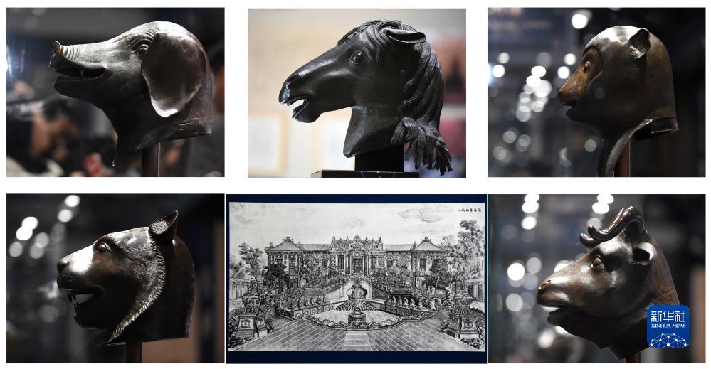 這是一張拼版照片:上三圖分別是豬首、馬首、猴首銅像(從左至右);下三圖分別為虎首銅像、現場展出的可看出十二獸首當年位置的圓明園銅版畫、牛首銅像(從左至右,10月20日攝)。