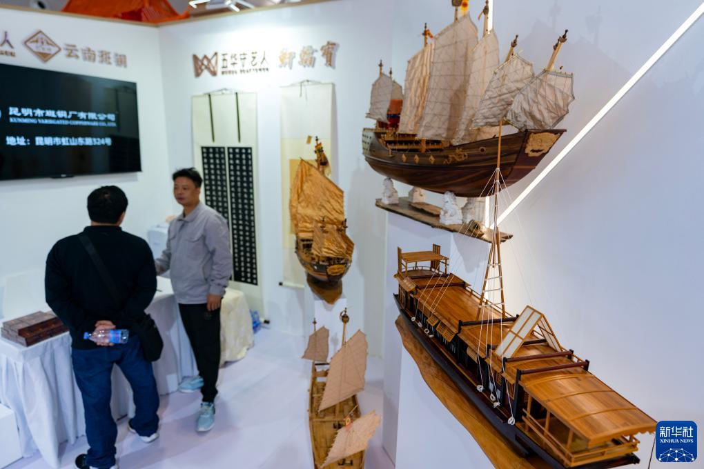 這是10月20日在創意雲南文化産業博覽會上拍攝的木船模型。