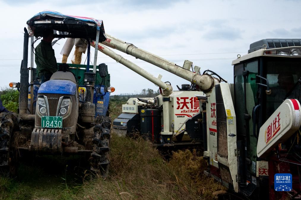 在湖北省天門市石家河鎮唐店村,農民將收割的水稻裝車(10月19日攝)。