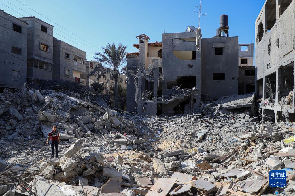 10月20日,在加沙地帶南部城市汗尤尼斯,男孩站在遭以色列襲擊損毀的建築中。