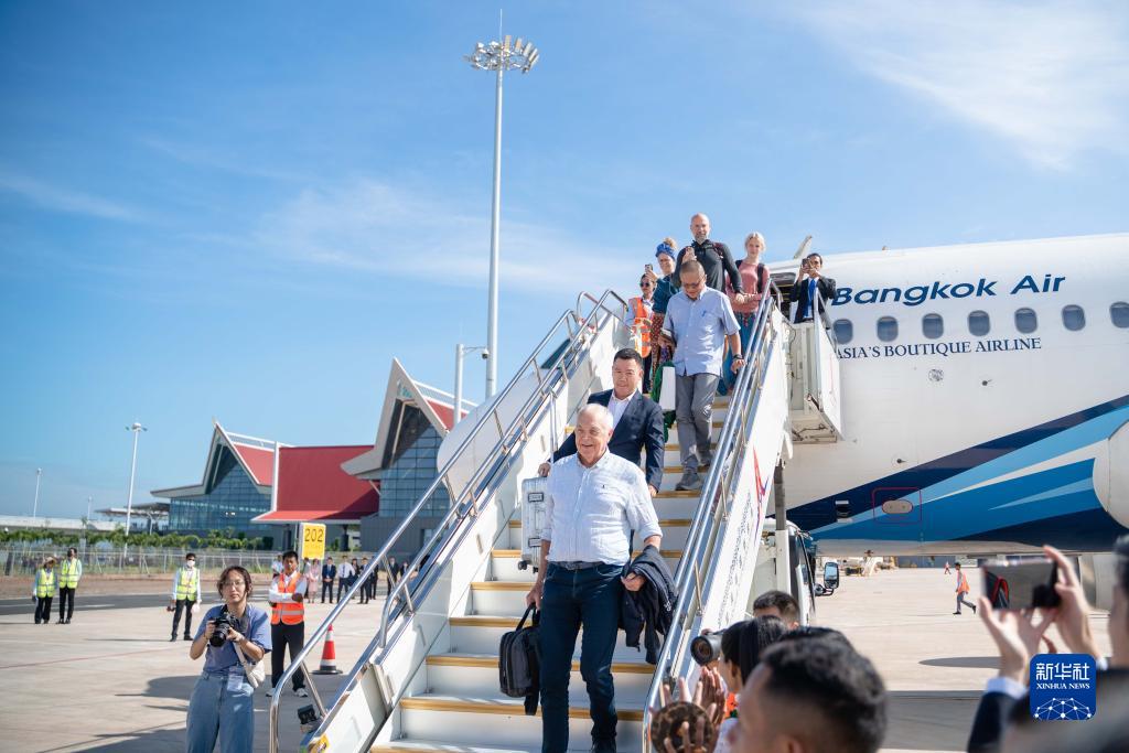 10月16日,在柬埔寨暹粒吳哥國際機場,首架進港客機乘客走下飛機。