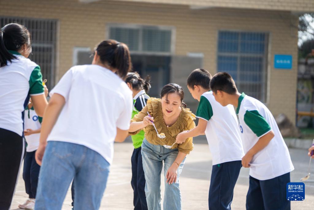 10月19日,常德市桃源特殊教育學校校長彭敏(中)和學生一起進行戶外活動。