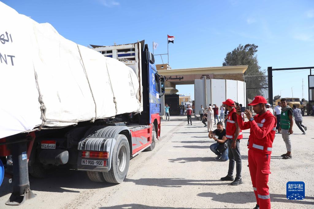 10月21日,在拉法口岸埃及一側,裝載有人道援助物資的貨車通過拉法口岸。