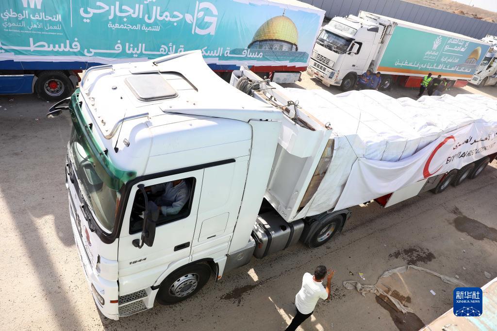 10月21日,在拉法口岸埃及一側,裝載有人道援助物資的貨車準備通過拉法口岸。