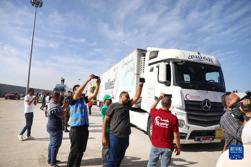 10月21日,在拉法口岸埃及一側,裝載有人道援助物資的貨車準備通過拉法口岸。