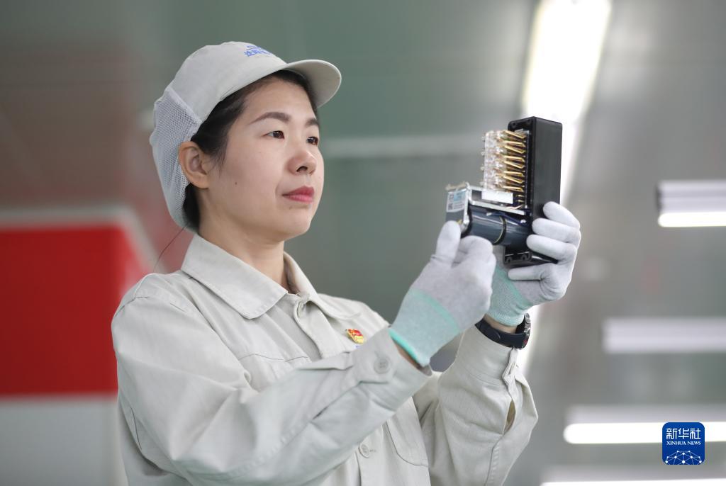 柯曉賓在瀋陽鐵路信號有限責任公司電器車間查看繼電器(10月17日攝)。