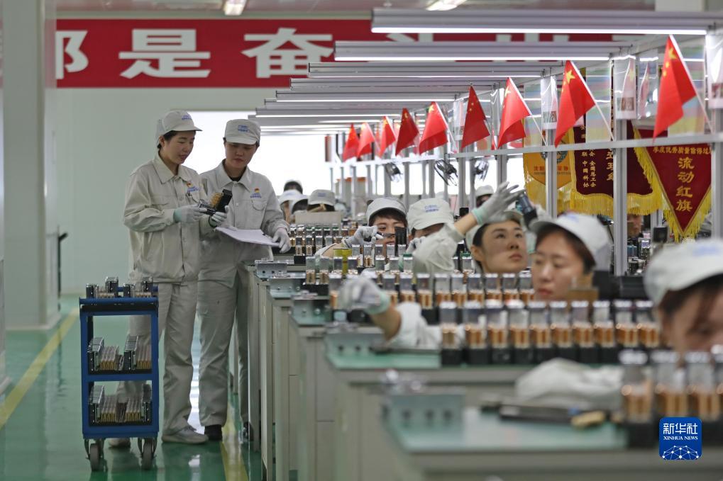柯曉賓(左一)在瀋陽鐵路信號有限責任公司電器車間分發繼電器(10月17日攝)。