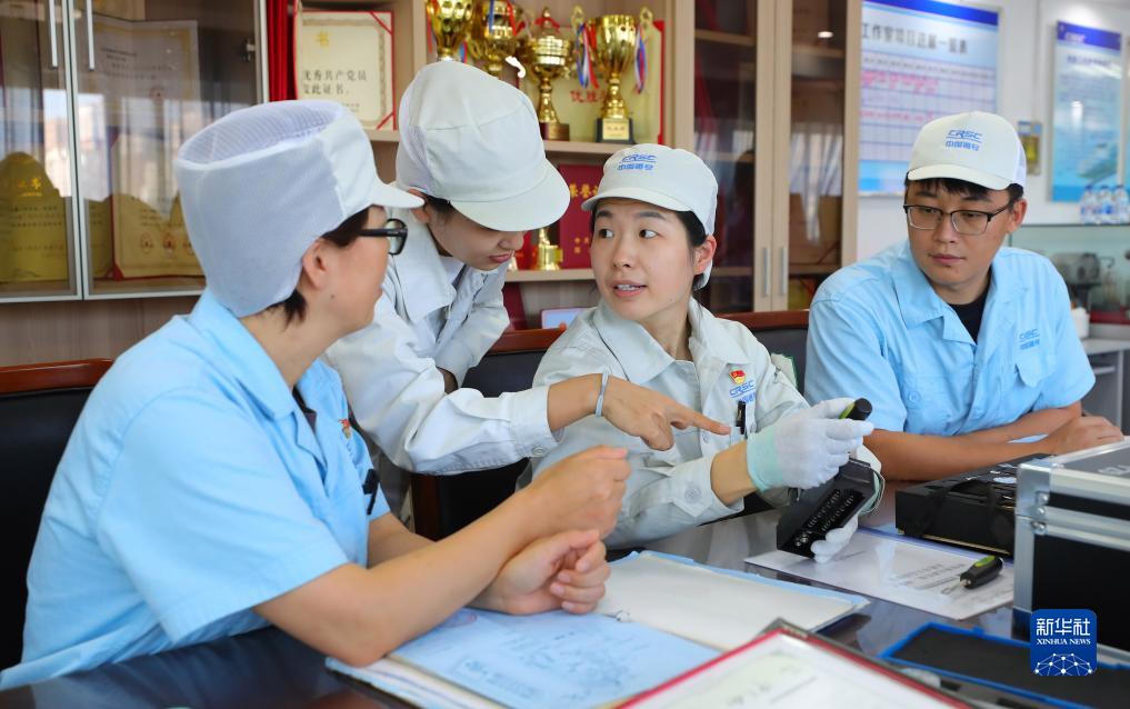 在瀋陽鐵路信號有限責任公司柯曉賓創新工作室,柯曉賓(右二)和同事探討繼電器調試方法(2022年9月7日攝)。