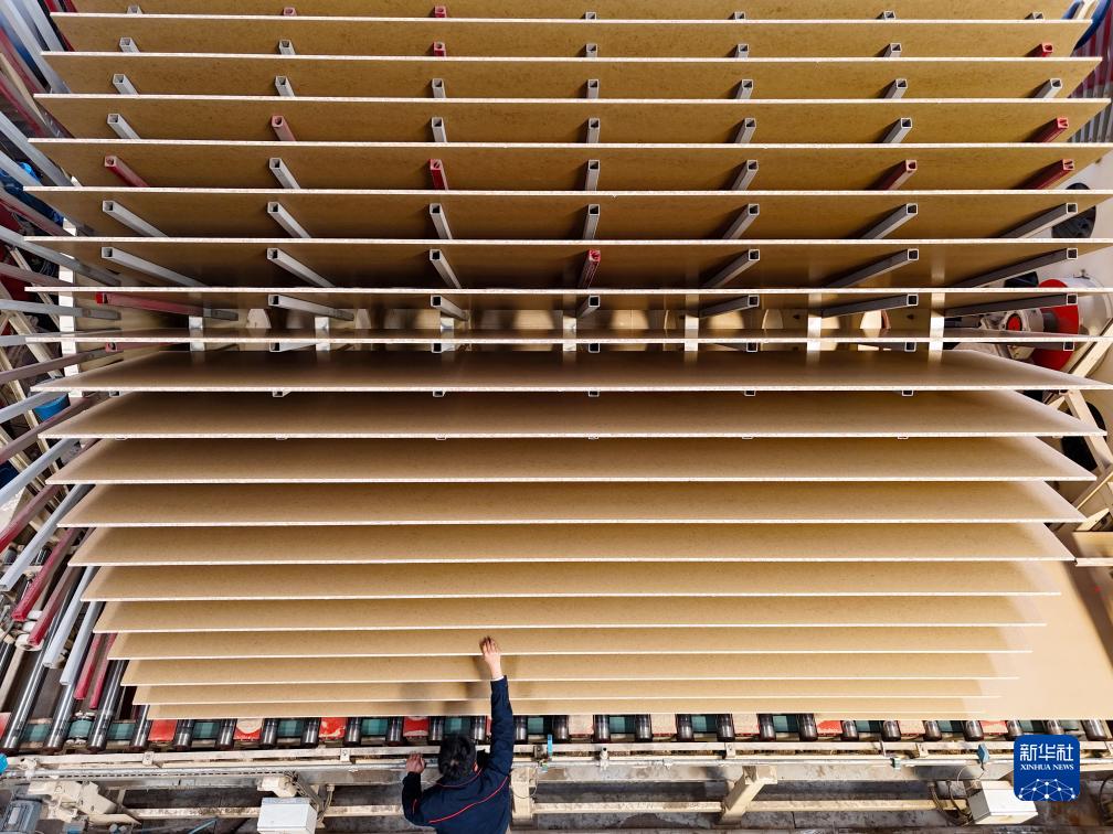 10月21日, 在山東省臨沂市蘭山區新港集團的生産車間,車間工人在對剛下線的刨花板進行外檢(無人機照片)。