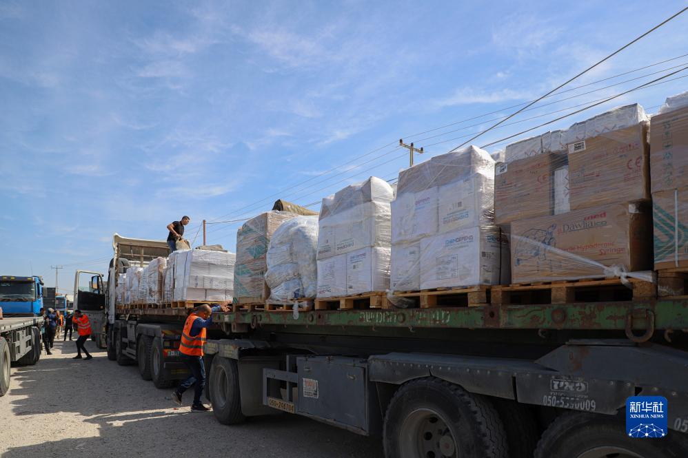 10月21日,工作人員在加沙地帶南部城市拉法卸貨。