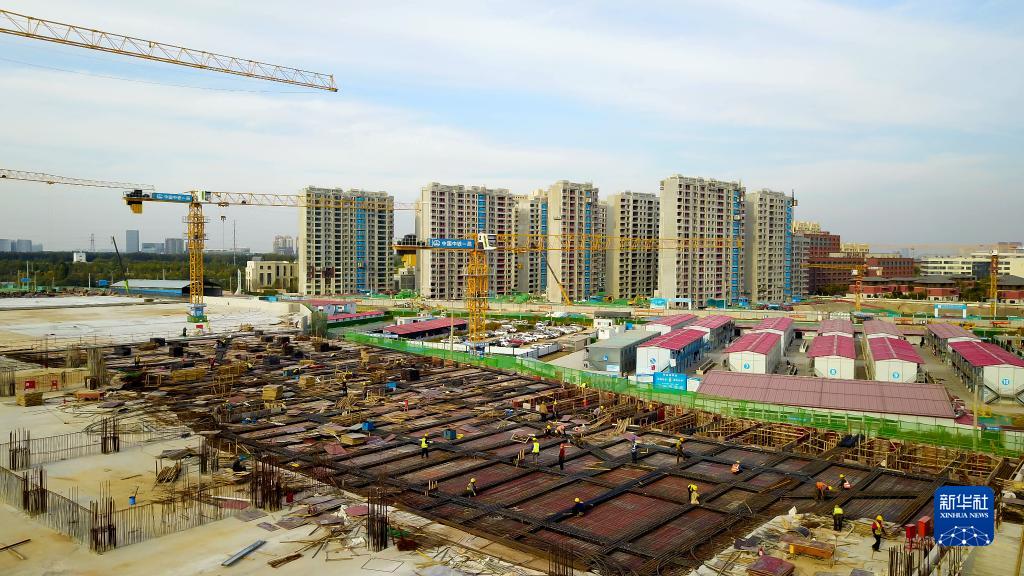 10月21日,在濟南地鐵6號線位裏莊車輛段,中鐵一局的工作人員在進行主體蓋板施工(無人機照片)。