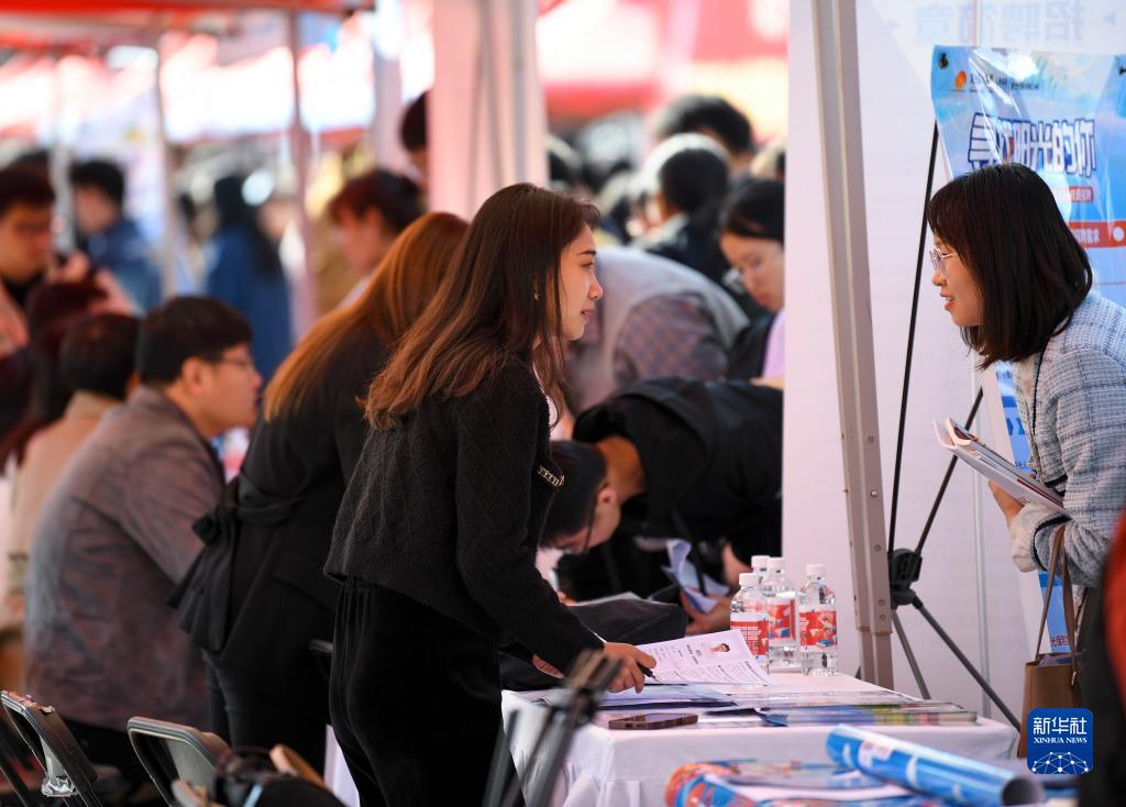 10月21日,高校學生(右一)在招聘會現場與用人單位工作人員交流。