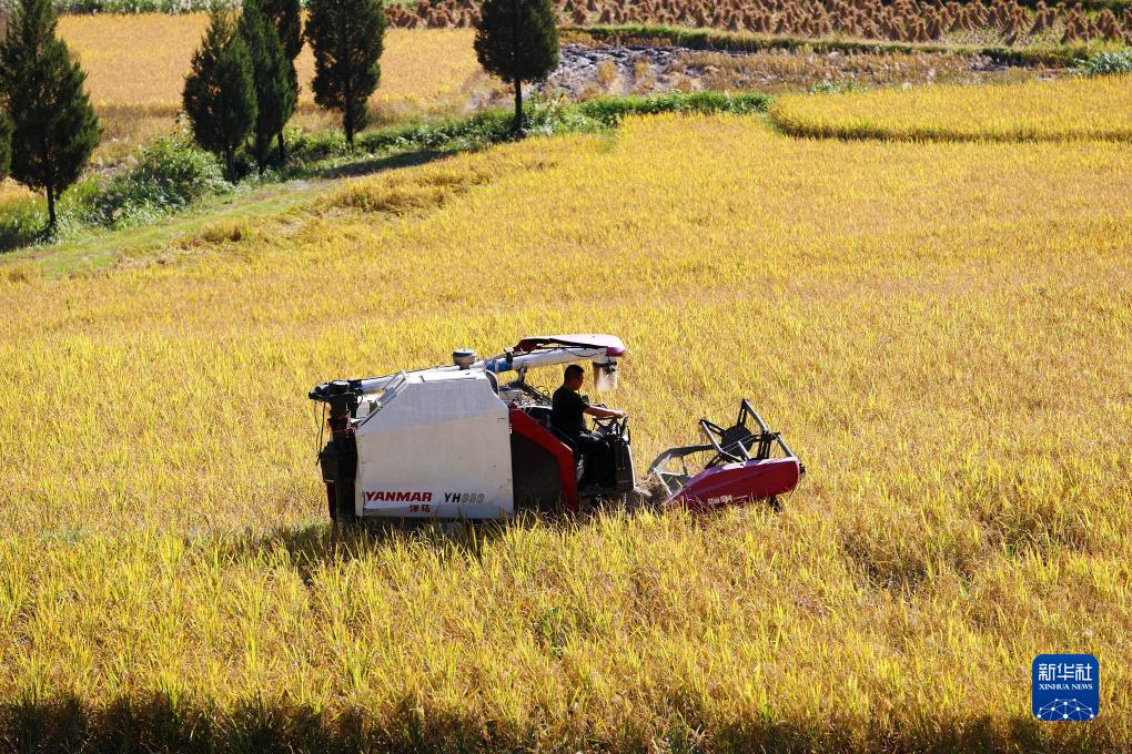 10月20日,農機手操作收割機在重慶市黔江區中塘鎮興泉社區有機水稻種植基地收割水稻。