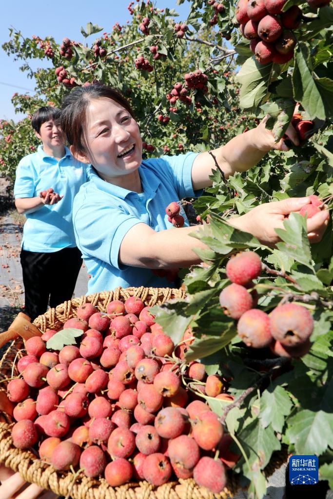 10月21日,農民在山東省東營市東營區現代高效農業産業園藍海逸園生態基地采收山楂。