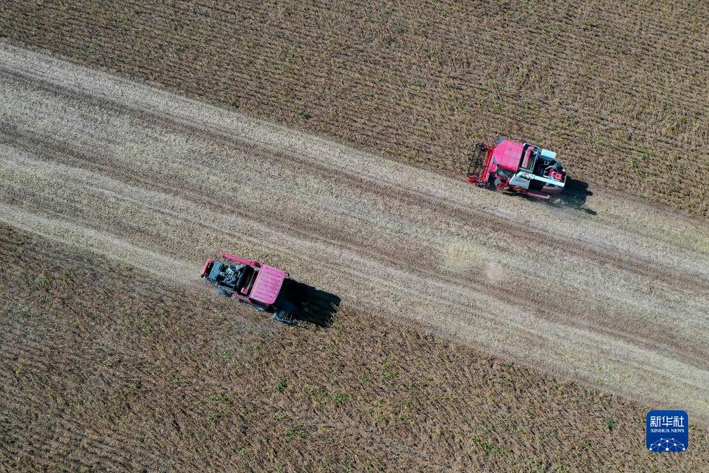 10月21日,在山東省東營市廣饒縣稻莊鎮西杜村的田地裏,農民駕駛收割機收穫大豆(無人機照片)。
