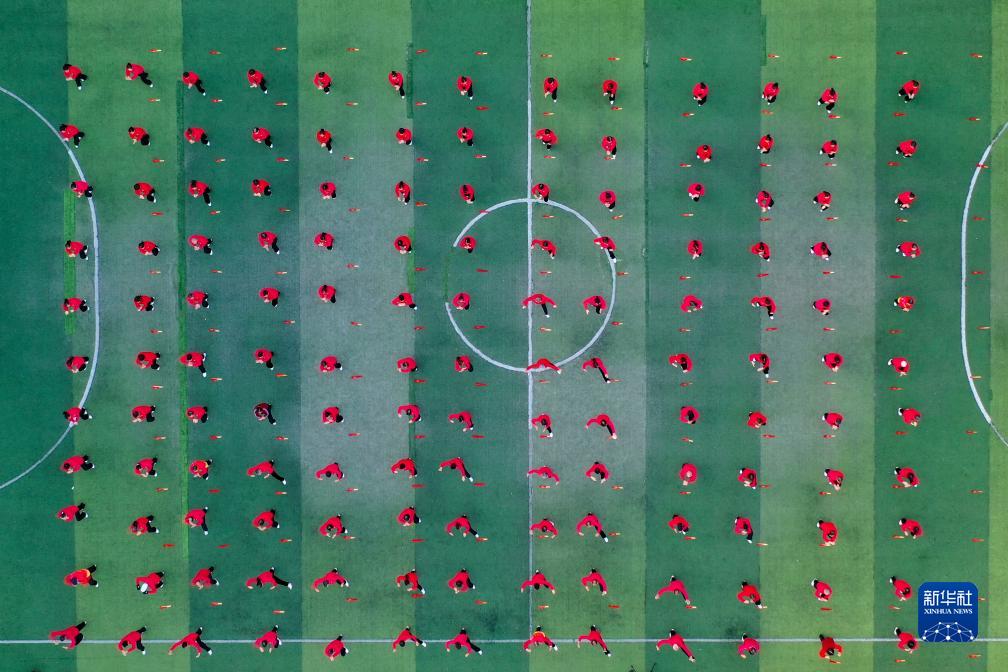 10月21日,在山東省東營市廣饒縣全民健身廣場,老年人在以“運動重陽 樂享銀齡”為主題的活動中展示太極拳項目(無人機照片)。