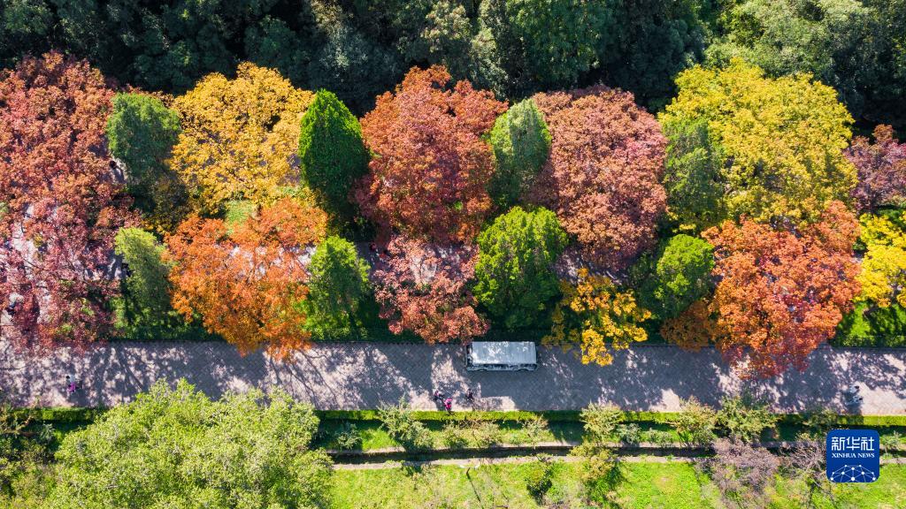 10月21日拍攝的南京明孝陵景區石象路秋景(無人機照片)。