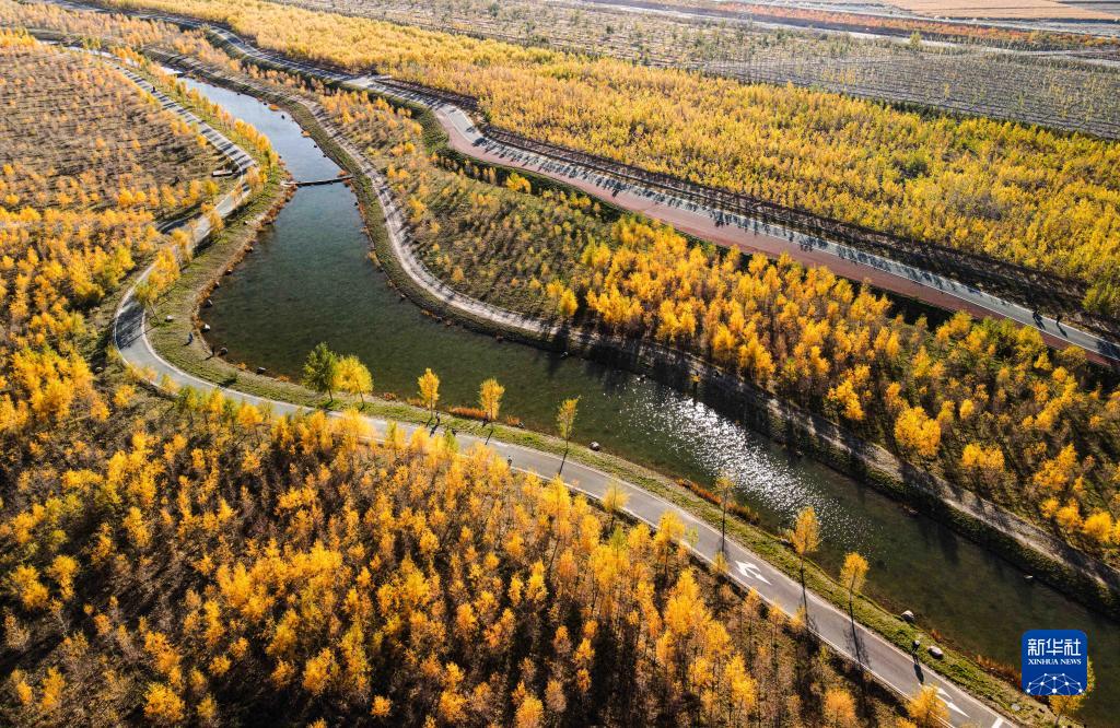 10月21日在甘肅省張掖市甘州區奧林匹克森林公園拍攝的金色的胡楊林(無人機照片)。