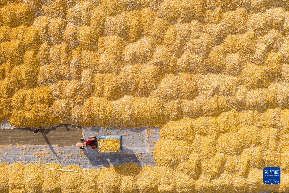 10月19日,在黑龍江省肇東市五里明鎮東升村,農民把收穫的玉米運到當地農業合作社指定的地點進行晾曬(無人機照片)。