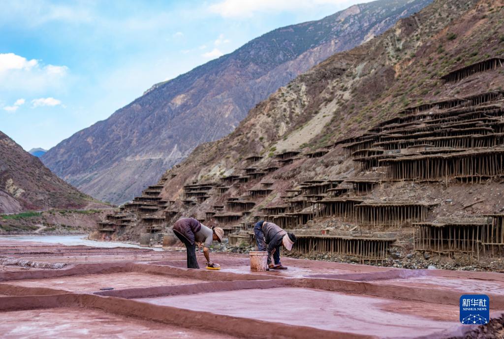 西藏昌都市芒康縣納西民族鄉村民在鹽田裏勞作(10月20日攝)。
