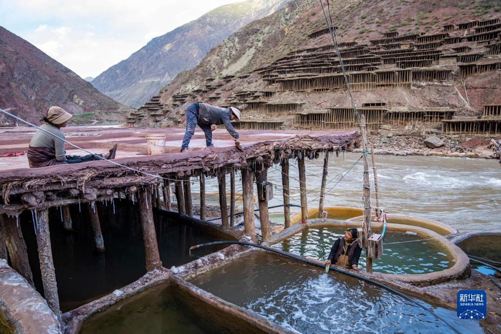 西藏昌都市芒康縣納西民族鄉村民在鹽田裏勞作(10月20日攝)。