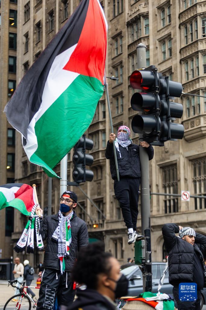 當天,芝加哥民眾走上街頭參加游行活動,表達對巴勒斯坦人民的支持,抗議以色列對加沙地帶的封鎖。