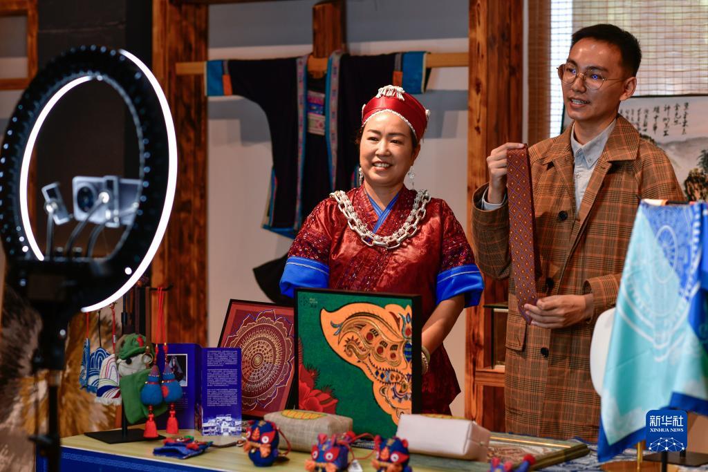 龍祿穎與兒子在公司的鄉村振興直播間推介苗繡文創産品(10月18日攝)。