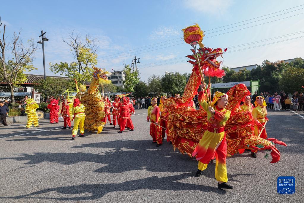 10月22日,香榧手工炒制大賽現場進行傳統舞龍表演,慶祝香榧豐收。