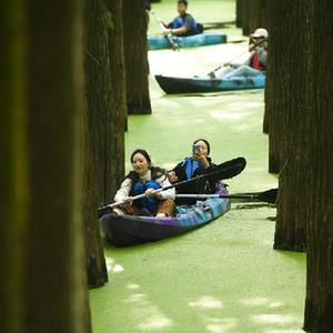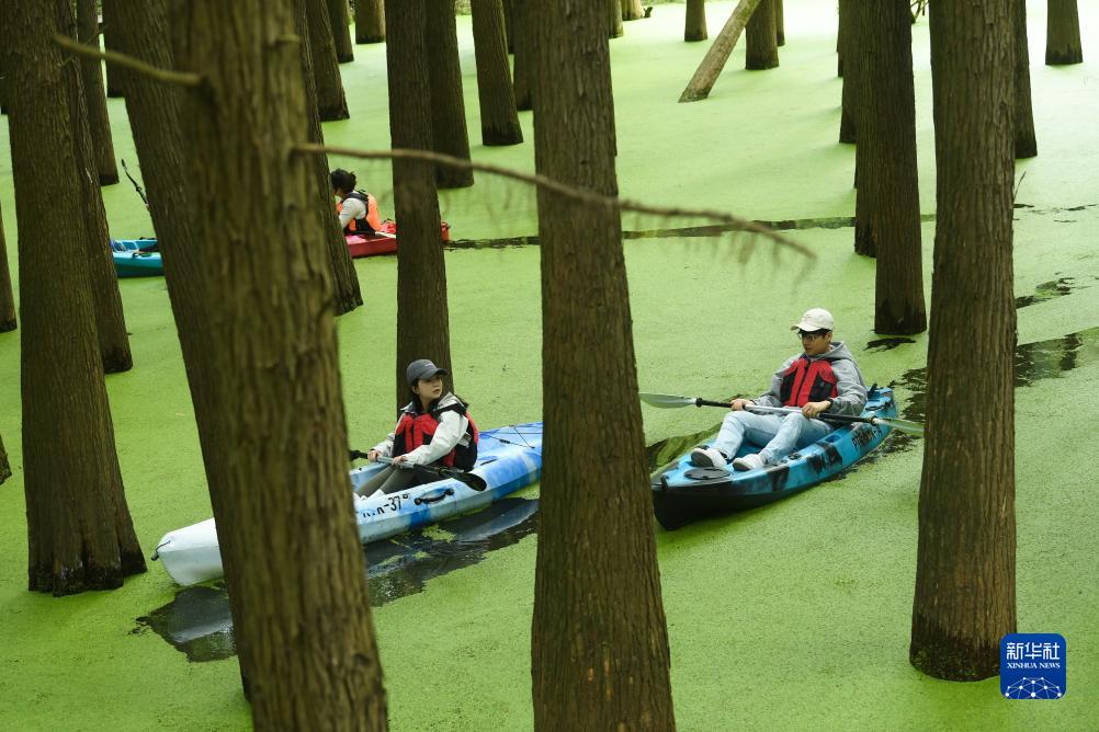 金秋時節,浙江杭州臨安青山湖近百畝池杉和落羽杉混交林呈現“抹茶森林”景觀,引得大批游客前來泛舟、漫步觀光。這片浸沒於水中的森林每到秋季就會鋪滿浮萍,浪漫景觀宛如“綠野仙蹤”。