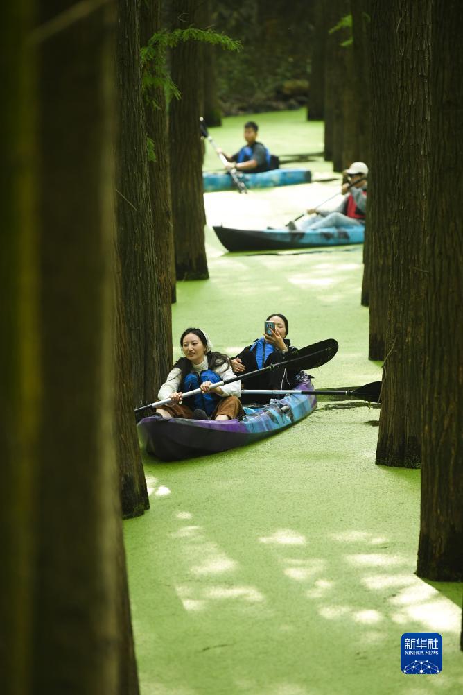 金秋時節,浙江杭州臨安青山湖近百畝池杉和落羽杉混交林呈現“抹茶森林”景觀,引得大批游客前來泛舟、漫步觀光。這片浸沒於水中的森林每到秋季就會鋪滿浮萍,浪漫景觀宛如“綠野仙蹤”。
