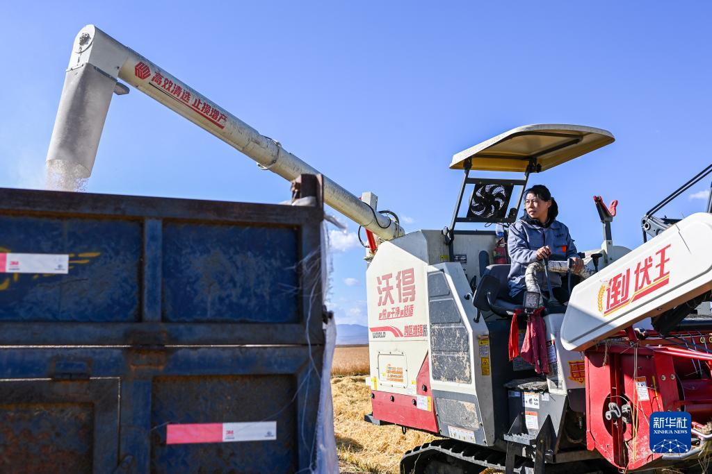 10月20日,劉春艷在琿春市三家子滿族鄉東崗子村的水稻田裏駕駛收割機收割水稻。