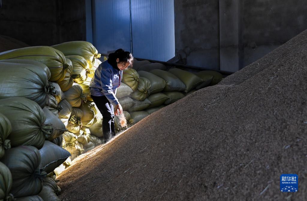 10月20日,劉春艷在自己農場的糧倉內查看水稻稻穀。