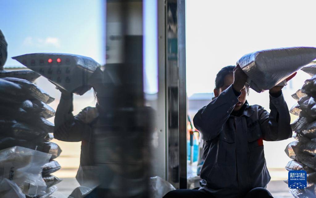 10月20日,劉春艷在她的現代化米業加工廠內打包大米。