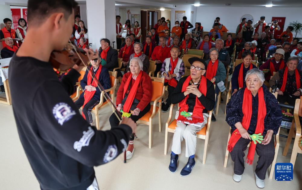 10月22日,在金煦福武侯萬壽頤養中心,一名西南交通大學數學學院青年志願者在給老人們表演小提琴。