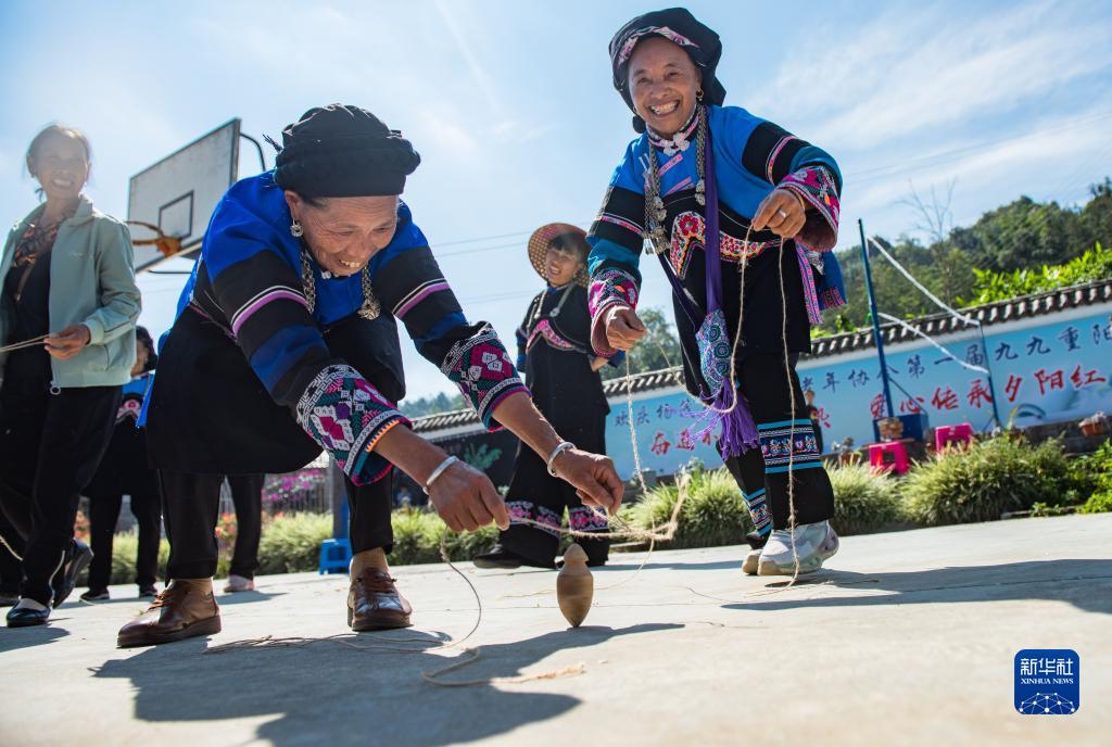 10月22日,雲南省文山壯族苗族自治州馬關縣木廠鎮楊茂松村村民在重陽節活動中打陀螺。